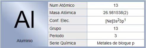 El aluminio es un elemento químico, de símbolo Al y número atómico 13. Se trata de un metal no ferromagnético. Es el tercer elemento más común encontrado en la corteza terrestre. Los compuestos de aluminio forman el 8 % de la corteza de la tierra y se encuentran presentes en la mayoría de las rocas, de la vegetación y de los animales. En estado natural se encuentra en muchos silicatos (feldespatos, plagioclasas y micas). Como metal se extrae únicamente del mineral conocido con el nombre de bauxita, por transformación primero en alúmina mediante el proceso Bayer y a continuación en aluminio metálico mediante electrólisis. Este metal posee una combinación de propiedades que lo hacen muy útil en ingeniería de materiales, tales como su baja densidad (2700 kg/m³) y su alta resistencia a la corrosión. Mediante aleaciones adecuadas se puede aumentar sensiblemente su resistencia mecánica (hasta los 690 MPa).