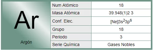 El argón es un elemento químico de número atómico 18 y símbolo Ar. Es el tercero de los gases nobles, incoloro e inerte como ellos, constituye el 0,934 % del aire seco.