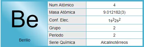 El berilio es un elemento químico de símbolo Be y número atómico 4. Es un elemento Alcalinotérreo bivalente, tóxico, de color gris, duro, ligero y quebradizo. Se emplea principalmente como endurecedor en aleaciones, especialmente de cobre.