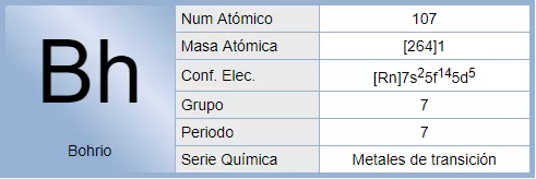 El bohrio es un elemento químico de la tabla periódica cuyo símbolo es Bh y su número atómico es 107. Su nombre le fue dado en honor al científico danés Niels Bohr.