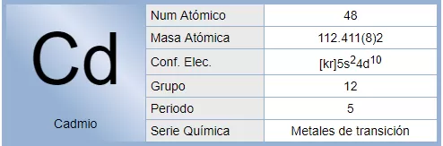 El cadmio es un elemento químico de número atómico 48 situado en el grupo 12 de la tabla periódica de los elementos. Su símbolo es Cd. Es un metal pesado, blando, blanco azulado, relativamente poco abundante. Es uno de los metales más tóxicos. Normalmente se encuentra en menas de cinc y se emplea especialmente en pilas.
