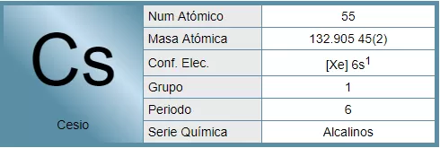 El cesio es el elemento químico con número atómico 55 y peso atómico de 132,905 uma. Su símbolo es Cs, y es el más pesado de los metales alcalinos en el grupo IA de la tabla periódica, a excepción del francio.