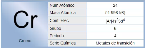 El cromo es un elemento químico de número atómico 24 que se encuentra en el grupo 6 de la tabla periódica de los elementos. Su símbolo es Cr. Es un metal que se emplea especialmente en metalurgia. Su nombre "cromo" (derivado del griego chroma, "color") se debe a los distintos colores que presentan sus compuestos.