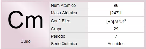 El curio es un elemento sintético de la tabla periódica cuyo símbolo es Cm y su número atómico es 96. Se produce bombardeando plutonio con partículas alfa (iones de helio). Es un actínido. El curio no existe en el ambiente terrestre, pero puede producirse en forma artificial. Sus propiedades químicas se parecen tanto a las de las tierras raras típicas que, si no fuera por su radiactividad, podría confundirse fácilmente con uno de estos elementos. Entre los isótopos conocidos del curio figuran los de número de masa 238 a 250. El isótopo 244Cm es de particular interés a causa de su uso potencial como una fuente compacta de fuerza termoeléctrica, al utilizarse el calor generado por decaimiento nuclear para generar fuerza eléctrica.