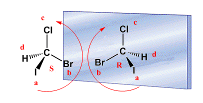 Una forma no experimental para nombrarlos es la que sigue las reglas de Prelog-Ingold-Cahn: Consiste en numerar a los grupos o átomos enlazados al carbono asimétrico, de acuerdo a su prioridad (el número 1 al más importante y el 4 al de menor importancia), si según el orden de las manecillas del reloj (sin contar al de menor importancia) este sigue su misma dirección se coloca una ere mayúscula (R), mientras que si es en sentido contrario a las agujas del reloj una ese minúscula (s). En el caso que el grupo o átomo con menor prioridad se encuentre adelante según la proyección de Fisher (en la horizontal), se considera que se está viendo desde atrás de la molécula, por lo que se considera al revés. En otras palabras si según Prelog-Ingold-Cahn, es R se debe considerar como S. En el caso en que exista más de un carbono asimétrico debe colocarse junto a la letra R o S, el número del carbono correspondiente. La Prioridad del átomo es definida en primera instancia por su número atómico o peso atómico en orden creciente (normalmente el de menor prioridad resulta ser un hidrógeno), y en segunda instancia por el número atómico de los átomos a los que está enlazado, considerando dobles enlaces como si estuviera unido a dos de esos átomos y de manera análoga los triples enlaces como si estuviera unido a tres de esos átomos.