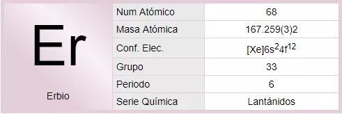 El erbio es un elemento químico de la tabla periódica cuyo símbolo es Er y su número atómico es 68. El erbio es un elemento un tanto raro de color plateado perteneciente a los lantánidos.