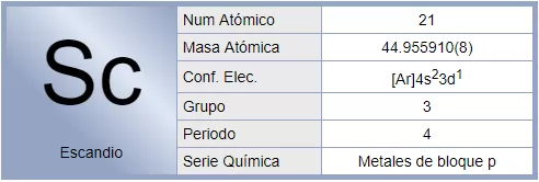 El escandio es un elemento químico de la tabla periódica cuyo símbolo es Sc y su número atómico es 21. Es un metal de transición que se encuentra en minerales de Escandinavia y que se clasifica con frecuencia entre los lantánidos por sus similitudes con ellos.
