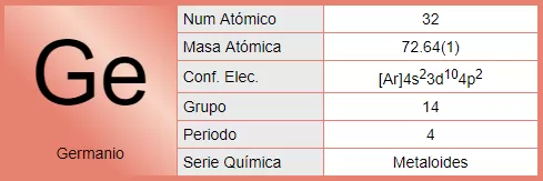 El germanio es un elemento químico con número atómico 32, y símbolo Ge perteneciente al período 4 de la tabla periódica de los elementos.