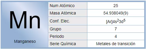 El manganeso es un elemento químico de número atómico 25 situado en el grupo 7 de la tabla periódica de los elementos y se simboliza como Mn. Se encuentra como elemento libre en la naturaleza, a menudo en combinación con el hierro y en muchos minerales. Como elemento libre, el manganeso es un metal con aleación de metales industriales con importantes usos, sobre todo en los aceros inoxidables.