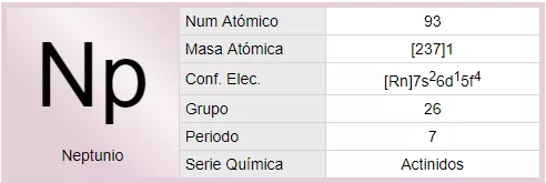 El neptunio es un elemento sintético de la tabla periódica cuyo símbolo es Np y su número atómico es 93. Cuarto de la familia de los actínidos o segundo período de transición interna del sistema periódico de los elementos. Su nombre proviene del planeta Neptuno.