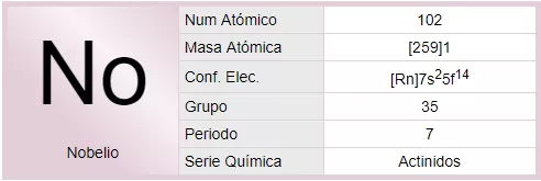 El nobelio (anteriormente llamado unnilbio (Unb)) es un elemento sintético de la tabla periódica cuyo símbolo es No y su número atómico es 102, llamado así en honor del inventor Alfred Nobel. Es el 11º elemento sintético de la tabla periódica. Su decaimiento se realiza por emisión de partículas alfa, es decir, un ion de helio doblemente cargado. Hasta la fecha sólo se han producido cantidades atómicas del elemento. El nobelio es el décimo elemento más pesado que el uranio producido sintéticamente y el 14º miembro de los actínidos.