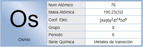 El osmio es un elemento químico de número atómico 76 que se encuentra en el grupo 8 de la tabla periódica de los elementos. Su símbolo es Os.