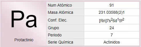 El protactinio es un elemento químico de la tabla periódica cuyo símbolo es Pa y su número atómico es 91, es un elemento metálico plateado que pertenece al grupo de los actínidos, que presenta un brillo metálico intenso. Es superconductor por debajo de 1.4 K.