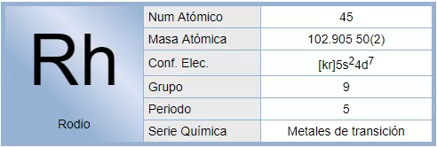 El rodio es un elemento químico de número atómico 45 situado en el grupo 9 de la tabla periódica de los elementos. Su símbolo es Rh. Es un metal de transición, poco abundante, del grupo del platino. Se encuentra normalmente en minas de platino y se emplea como catalizador en algunas aleaciones de platino.