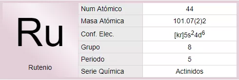 El rutenio es un elemento químico de número atómico 44 situado en el grupo 8 de la tabla periódica de los elementos. Su símbolo es Ru. Es un metal de transición, poco abundante, del grupo del platino. Se encuentra normalmente en minas de platino y se emplea como catalizador en algunas aleaciones de platino.