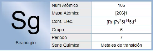 El seaborgio es un elemento químico de la tabla periódica cuyo símbolo es Sg y su número atómico es 106. Es un elemento sintético cuyo isótopo más estable es el 271Sg que tiene una vida media de 2,4 minutos. Su naturaleza química es similar a la del wolframio.