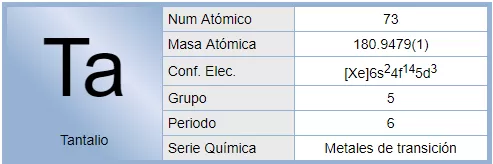 El tántalo o tantalio, es un elemento químico de número atómico 73, que se sitúa en el grupo 5 de la tabla periódica de los elementos. Su símbolo es Ta. Se trata de un metal de transición raro, azul grisáceo, duro, que presenta brillo metálico y resiste muy bien la corrosión. Se encuentra en el mineral tantalita. Es fisiológicamente inerte, por lo que entre sus variadas aplicaciones, se puede emplear para la fabricación de instrumentos quirúrgicos y en implantes.
