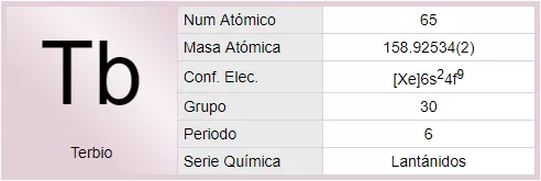El terbio es un elemento químico de la tabla periódica cuyo símbolo es Tb, sólido metálico de color blanco y brillo plateado. Su número atómico es 65, con una masa atómica de 158,9. Tiene una densidad de 8,3 g/cm3. Con un punto de fusión de 1.360 °C y un punto de ebullición de 3.041 °C. Es un metal de transición interna de la familia de los lantánidos del Sistema Periódico. Se encuentra habitualmente como óxido en las tierras raras. Forma sales trivalentes de color blanco cuyas soluciones son incoloras. Su concentración en la corteza terrestre es de 0,09 ppm.