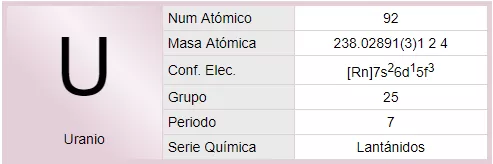 El uranio es un elemento químico metálico de color plateado-grisáceo de la serie de los actínidos, su símbolo químico es U y su número atómico es 92. Por ello posee 92 protones y 92 electrones, con una valencia de 6. Su núcleo puede contener entre 142 y 146 neutrones, sus isótopos más abundantes son el 238U que posee 146 neutrones y el 235U con 143 neutrones. El uranio tiene el mayor peso atómico de entre todos los elementos que se encuentran en la naturaleza. El uranio es aproximadamente un 70% más denso que el plomo, aunque menos denso que el oro o el wolframio. Es levemente radiactivo.